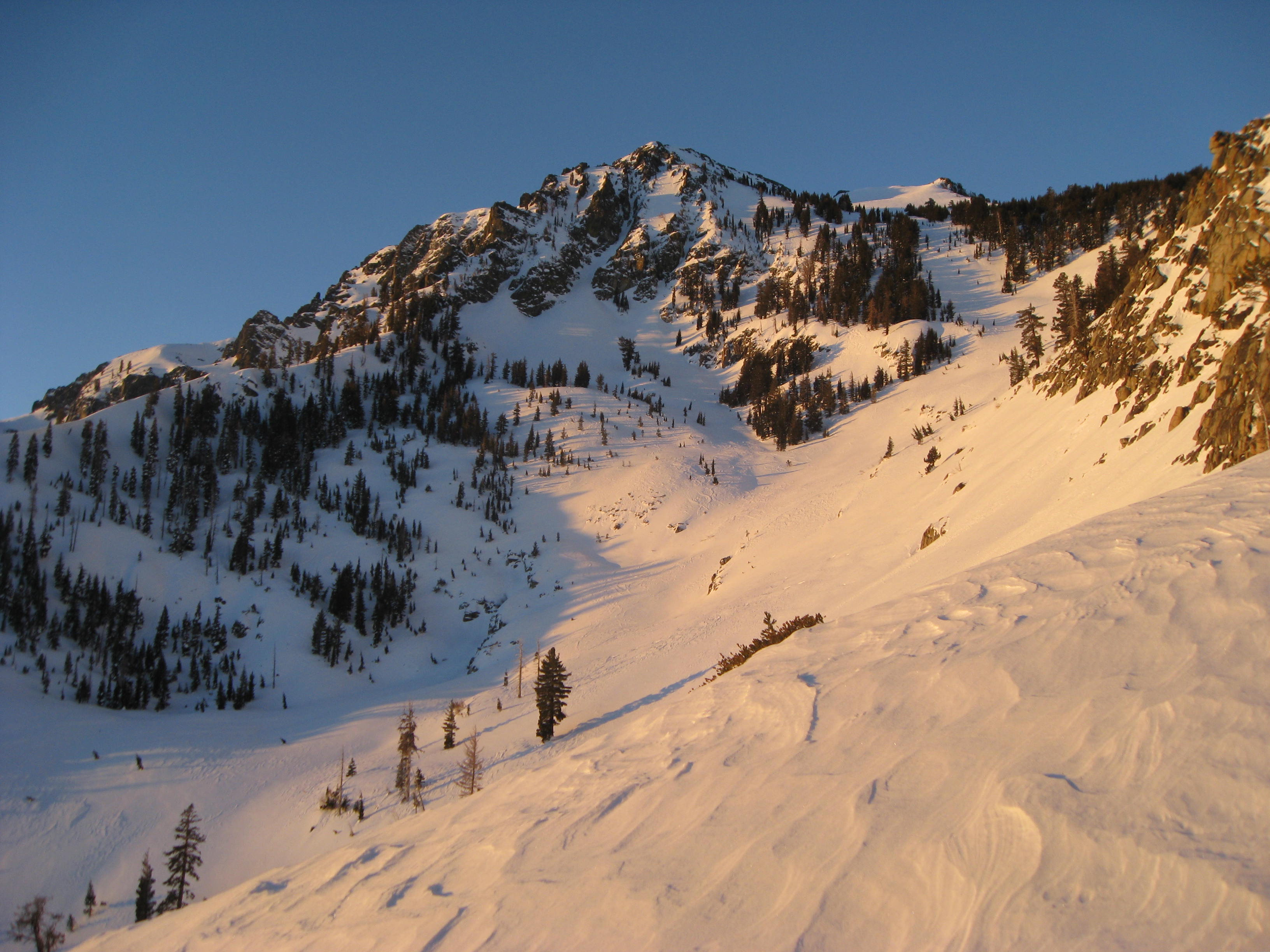 It isn’t particularly difficult terrain, but the 100′ cliff at the bottom makes you ski pretty cautiously. Fun times before work!