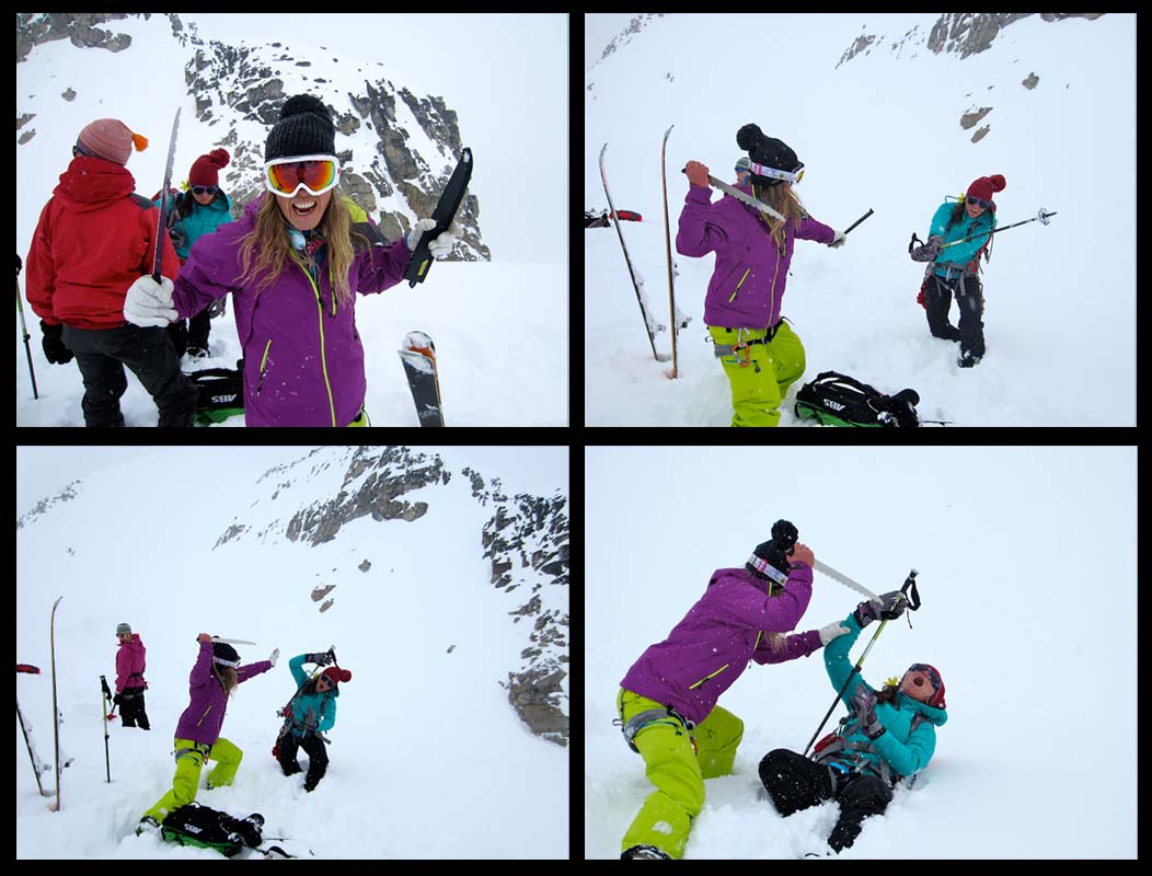 So far, we had short weather windows and unideal light, but the camaraderie of the group and the overall setting kept our spirits high. In addition to learning new skills daily, singing 90s songs, synchronized skiing, dancing randomly, throwing snowballs, and an ever-evolving female freeskier rap kept us laughing and smiling. My best line was, “Want botox, how about a knee to the face, we got fat lips, scars all over the place.” It was just awesome to be around so many like-minded (and scarred) individuals and it was only day 4!
