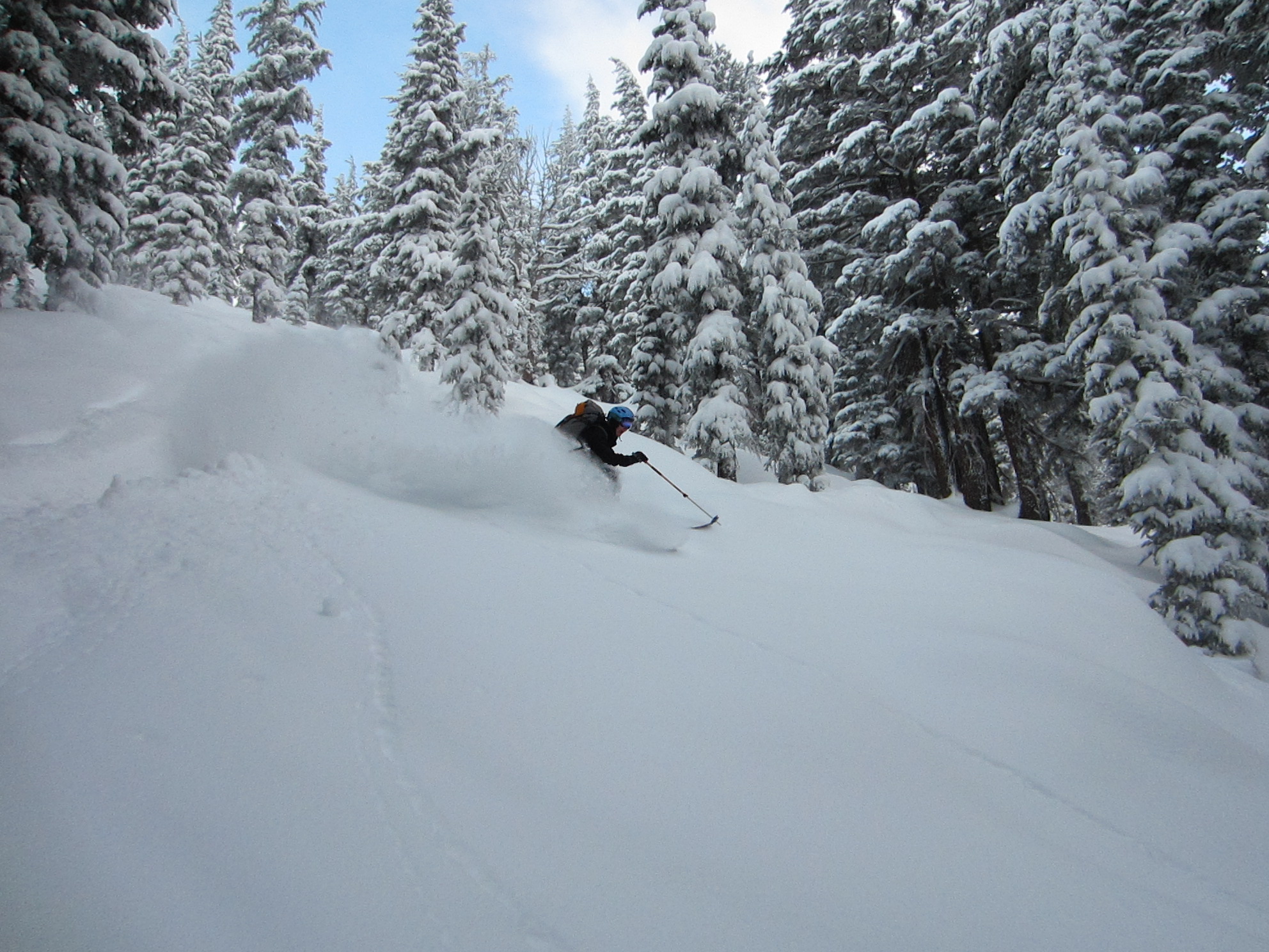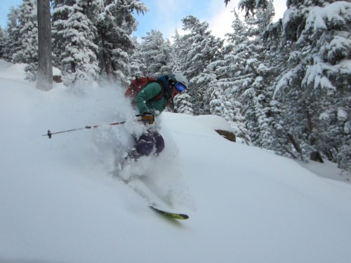 We then had about an hour of skinning to reach the main run. We watched as another guided party made wedge turns down the first part of the run. Wow. I can’t even imagine how long it must have taken them to descend 6,000′! After a snack, we began our descent, which started out with wind affected and tracked snow and then opened up to some perfect powder. High-fiving at the bottom of the middle section, Domi and I agreed that it was the longest powder run we had ever experienced… and she had been heli-skiing in Alaska! And… we still had about 2,000 feet to go!